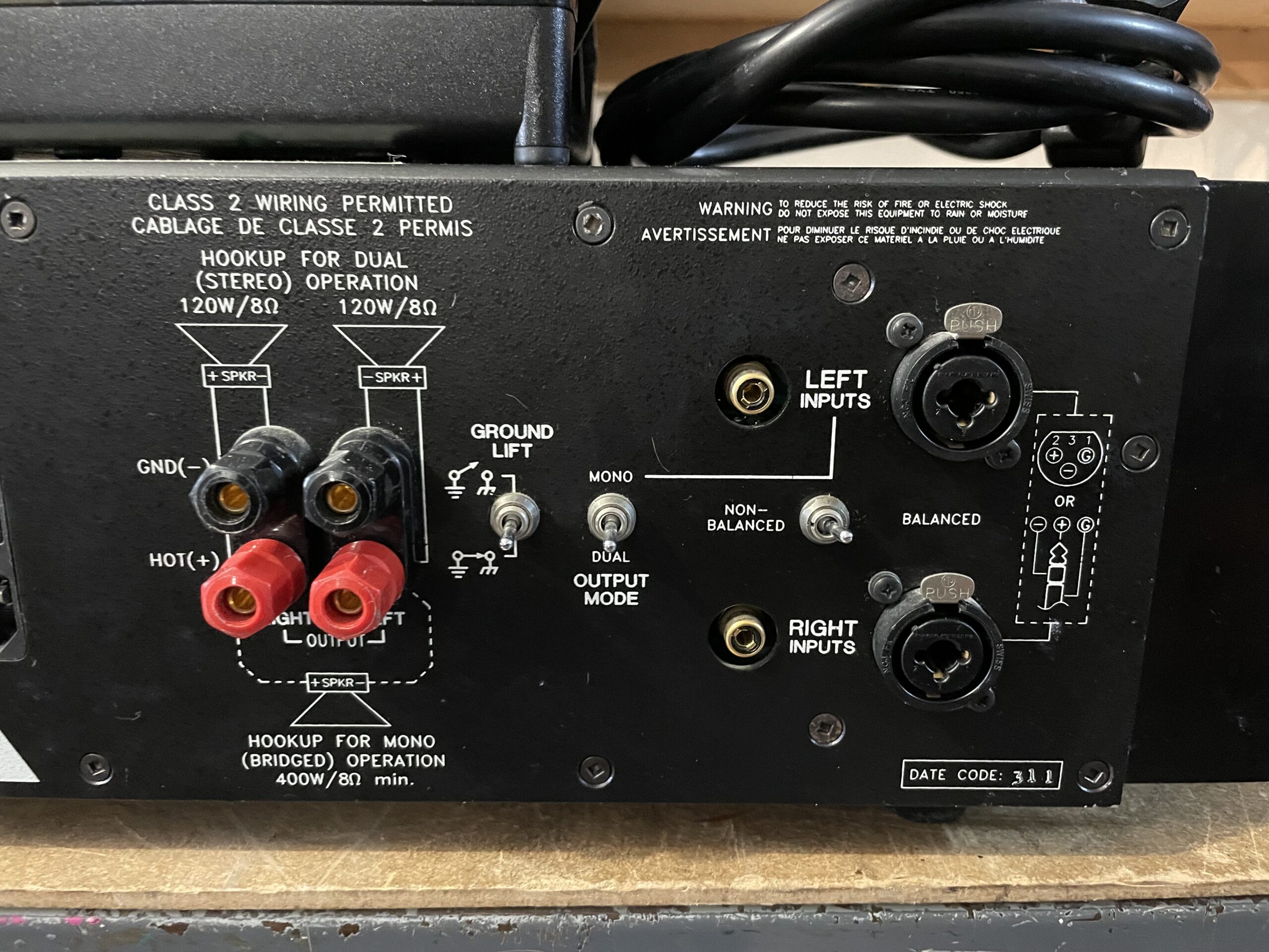 The back panel has a complete set of inputs and switches. Each connector or switch is surrounded by clearly labeled instructions in white lacquer, in English and French. This makes it possible to set up the amplifier without having to locate the written instruction sheet. From left to right along the back panel are the following features: first, a detachable AC connector with a removable fuse holder containing two 250V, 4A fuses, one for each channel. A « Ground Lift » toggle switch is connected between the chassis ground (including the power cord’s third prong) and the signal ground. Occasionally a grounding situation with another component, such as a preamplifier or another amplifier also equipped with a three-pronged grounded line cord, will cause a 60Hz hum from a ground loop set up between signal and chassis ground. Switching the Ground Lift into the up, or open, position reduces 60Hz hum without resorting to a cheater plug. This proved useful in my system, with its 45′ of single-ended interconnect runs between preamplifier and crossover.